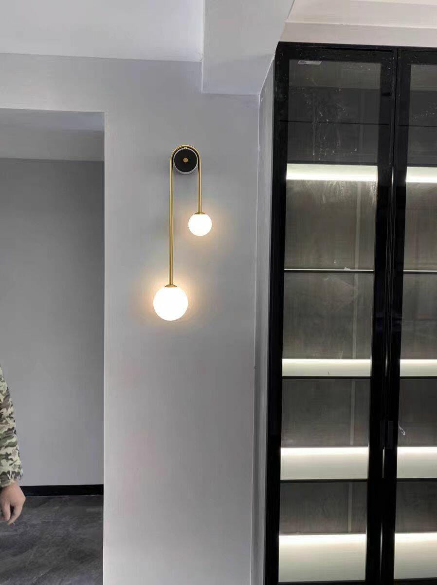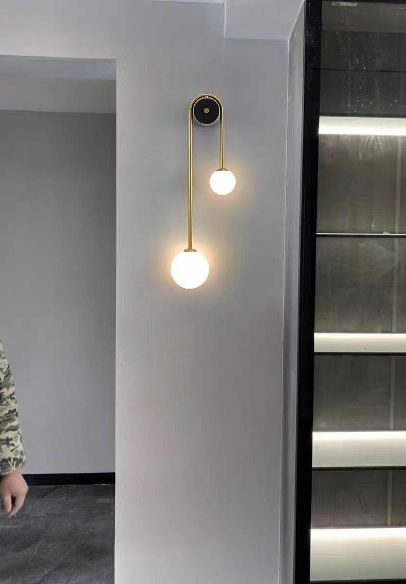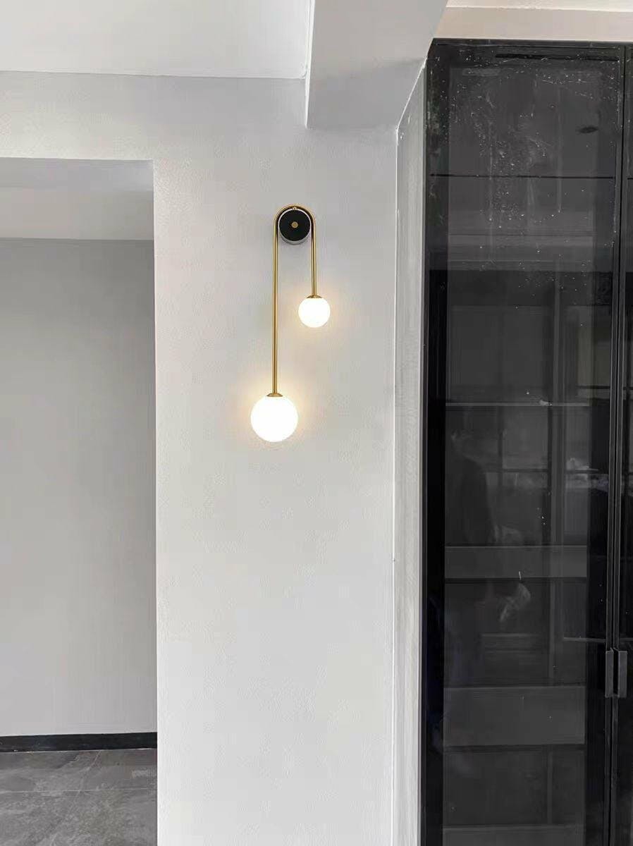 Style our brass curve wall light along your hallway, or in your living room, or use it as bedside light to add edge and juxtaposition. The thick brass curved metal body that features two white glass shades hanging at different heights is suspended from the wall to create even more of a dramatic focal feature in your home.