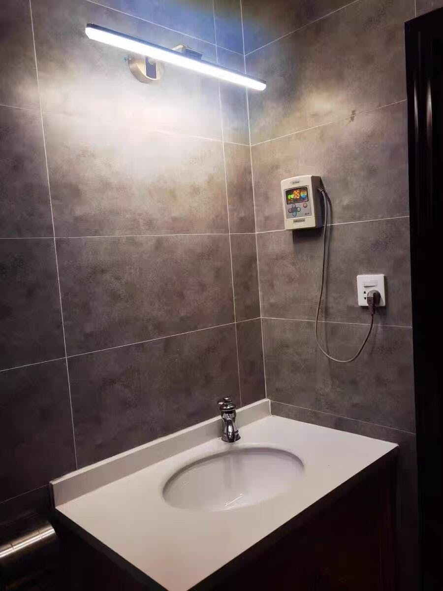This LED bathroom vanity features a modern clean design with a front light cover made of acrylic and a rear panel made of brass. It is an LED light source.