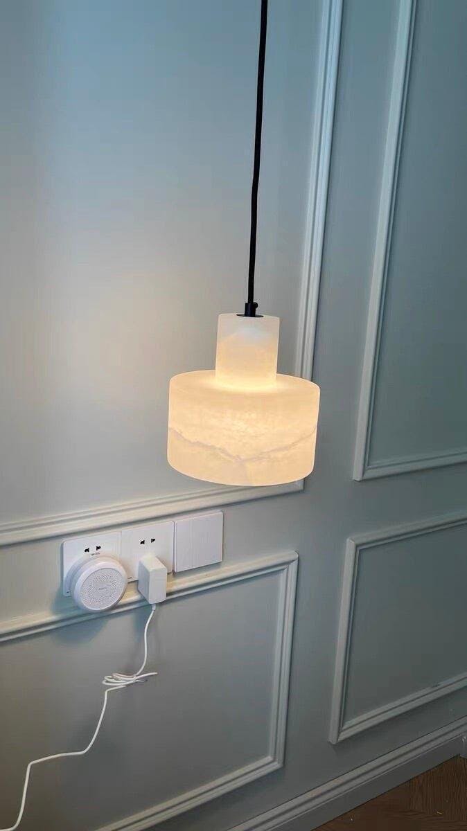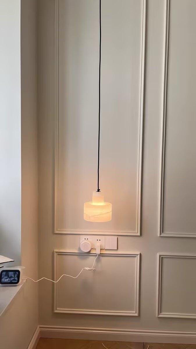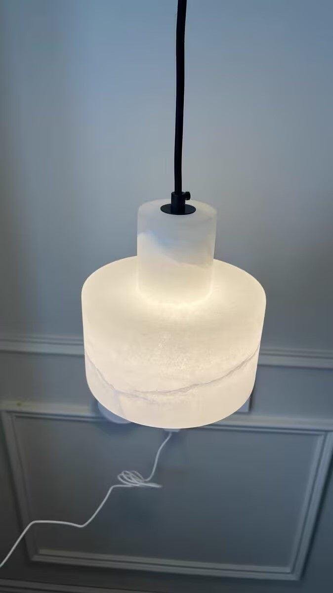Suspended, Cyls spreads its elegant and warm light. This lamp features a Three-dimensional complemented by a shade made of Hand cut and polished alabaster lampshade.