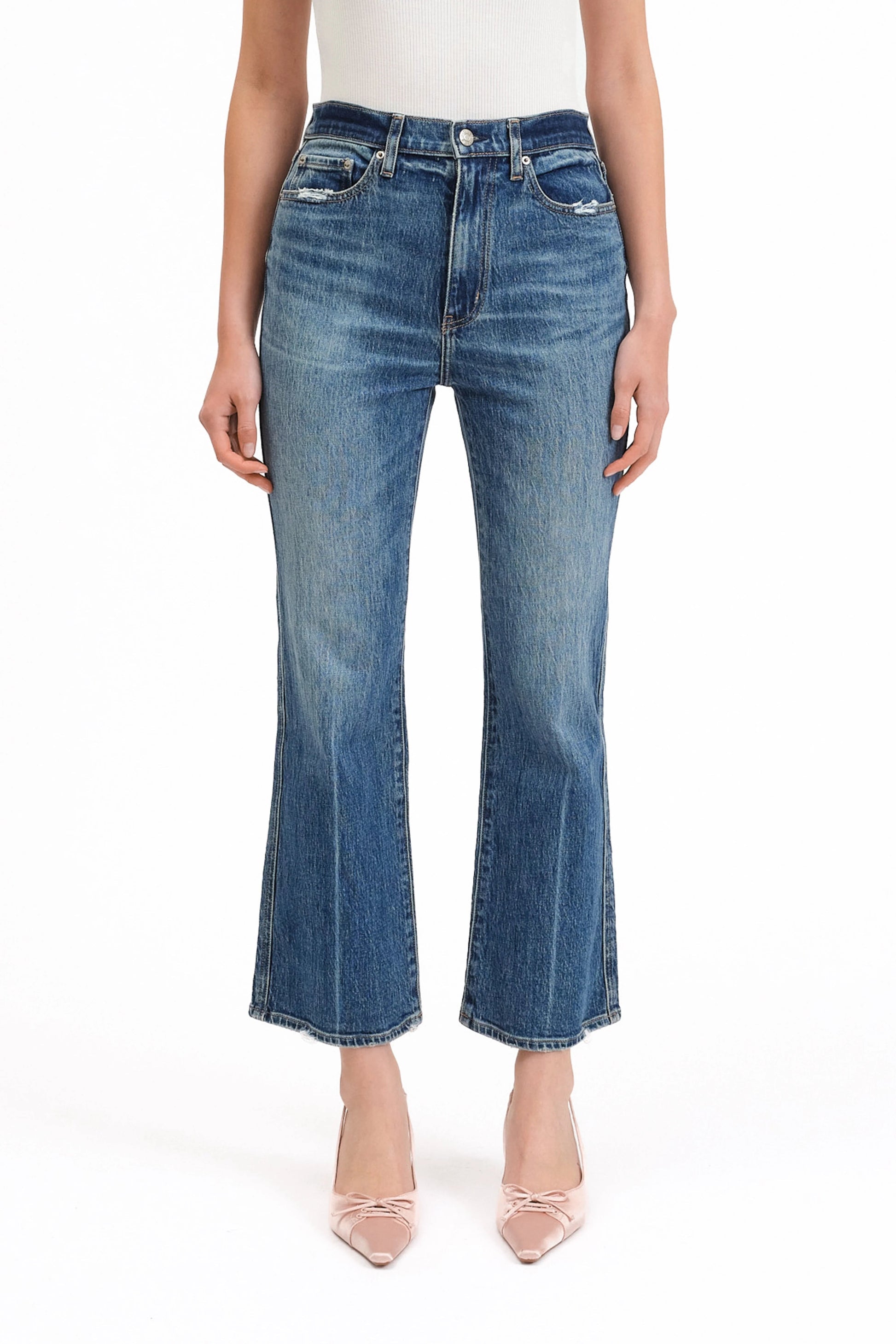 Step into a modern silhouette with high-rise jeans featuring a tailored flare, front crease, and authentic vintage character.