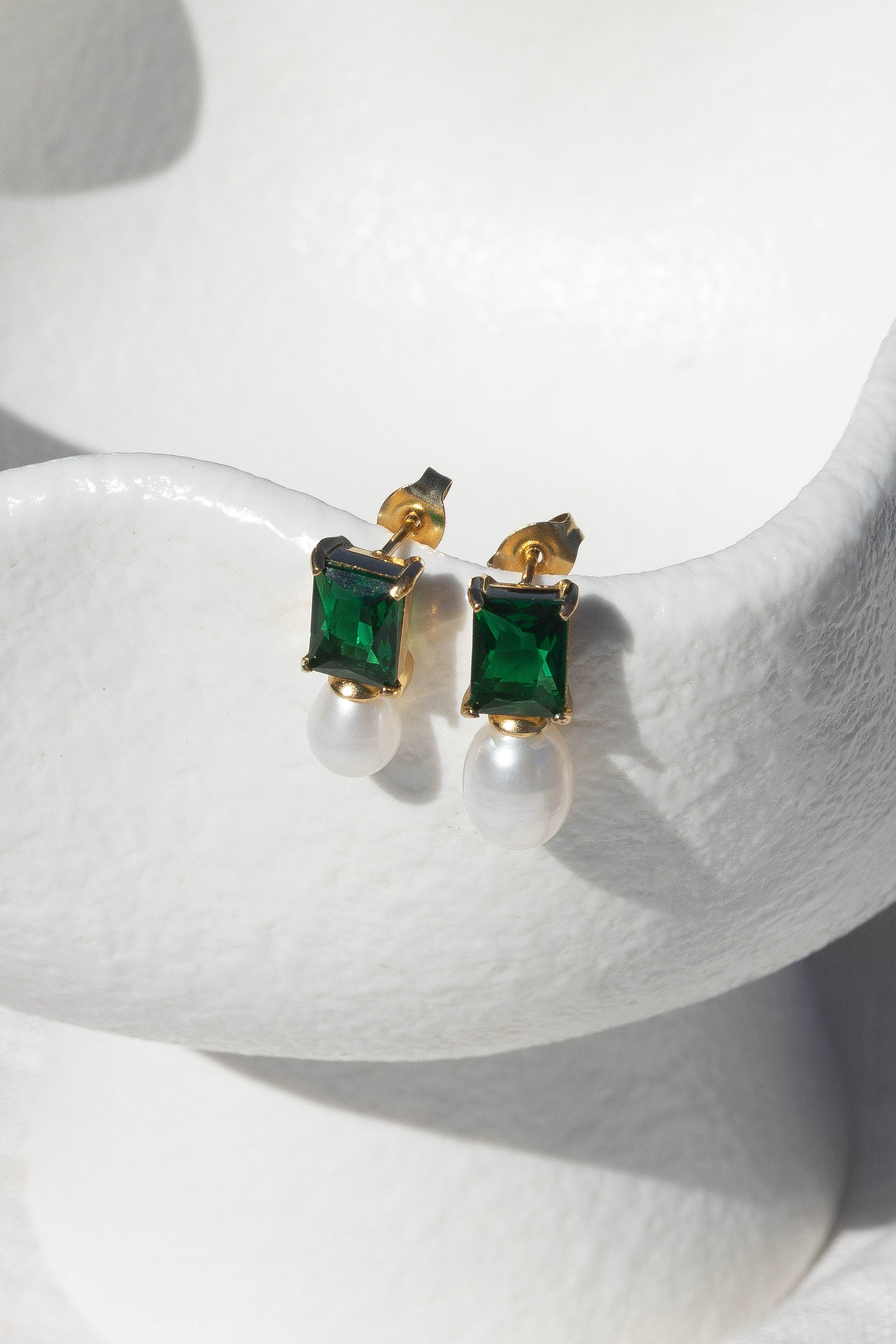 Details: drop style, rhinestone stud, faux pearl detail, gold-plated finish, stud closure, titanium steel/plastic pearl/rhinestone, 1" length.